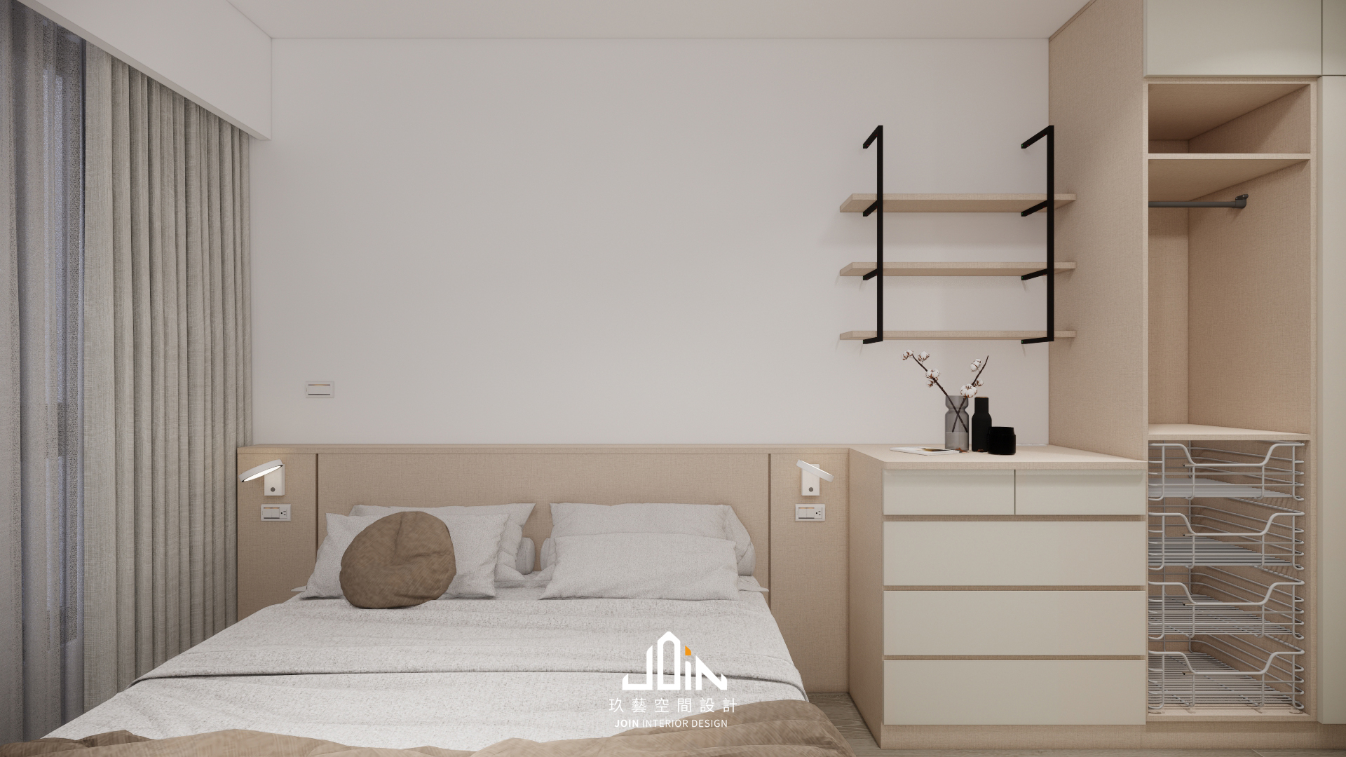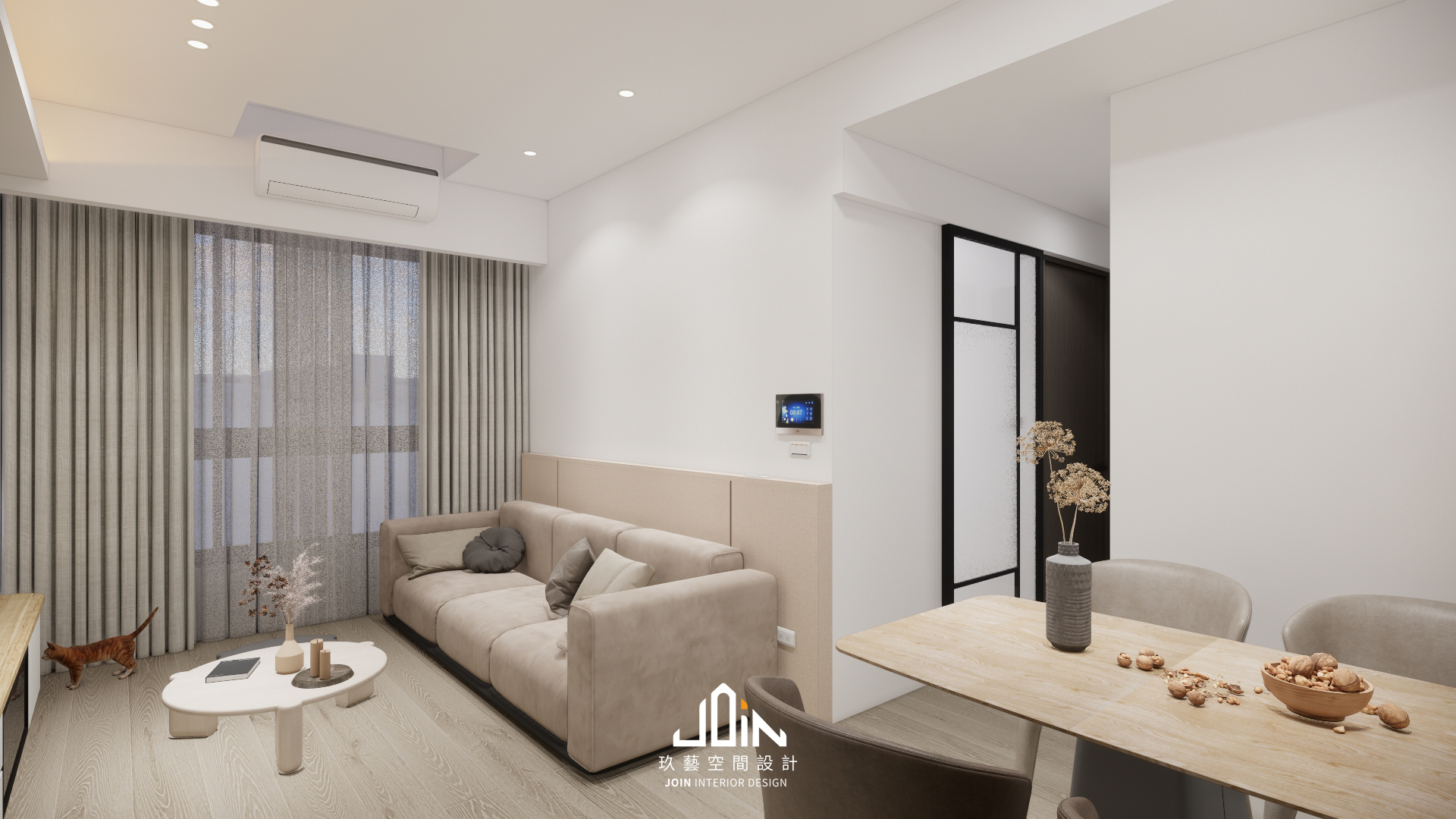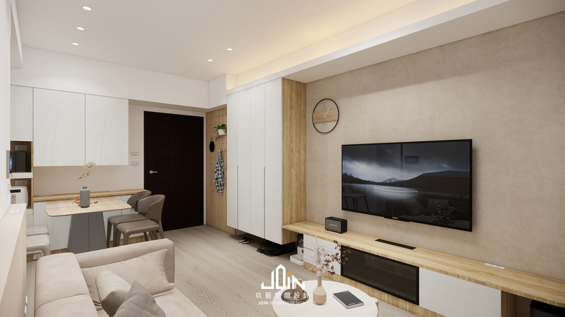 電視牆以米色藝術漆鋪陳,帶著細膩手感與淡淡光澤,