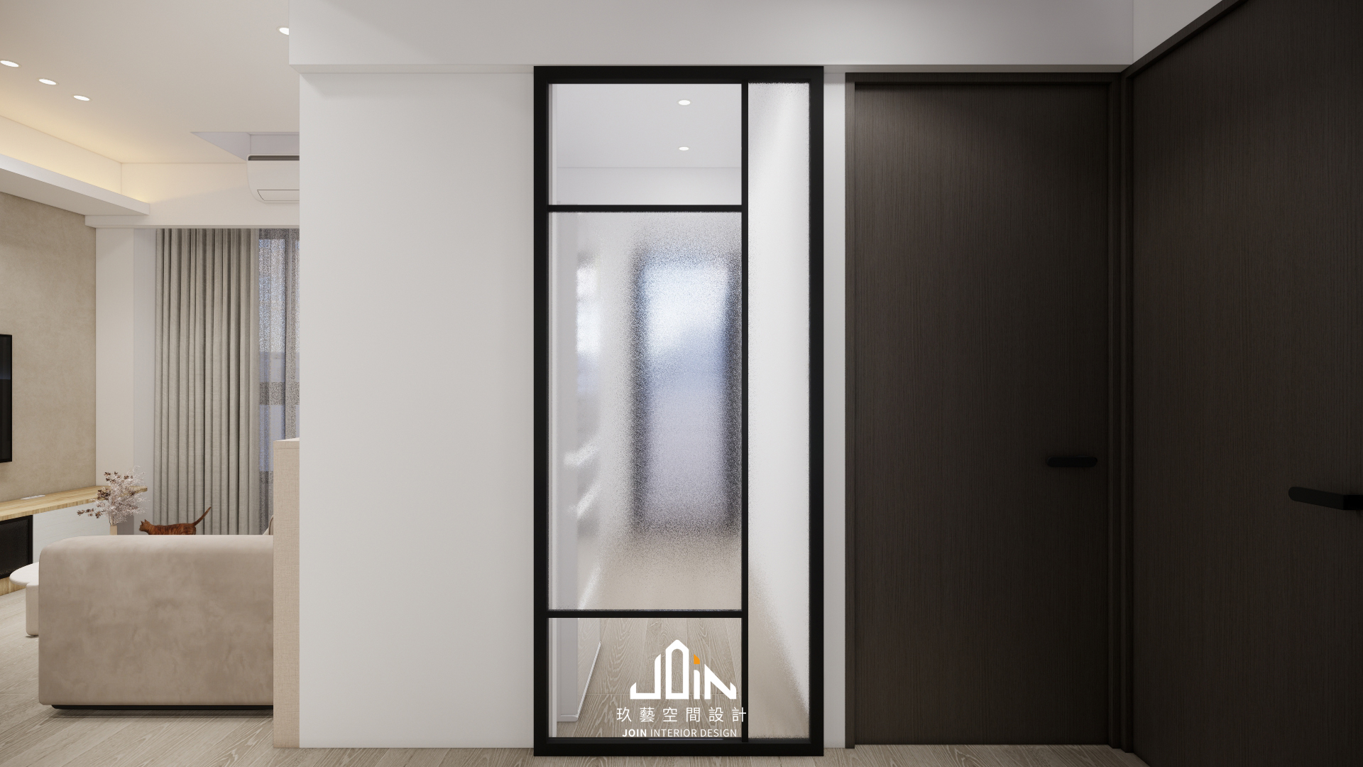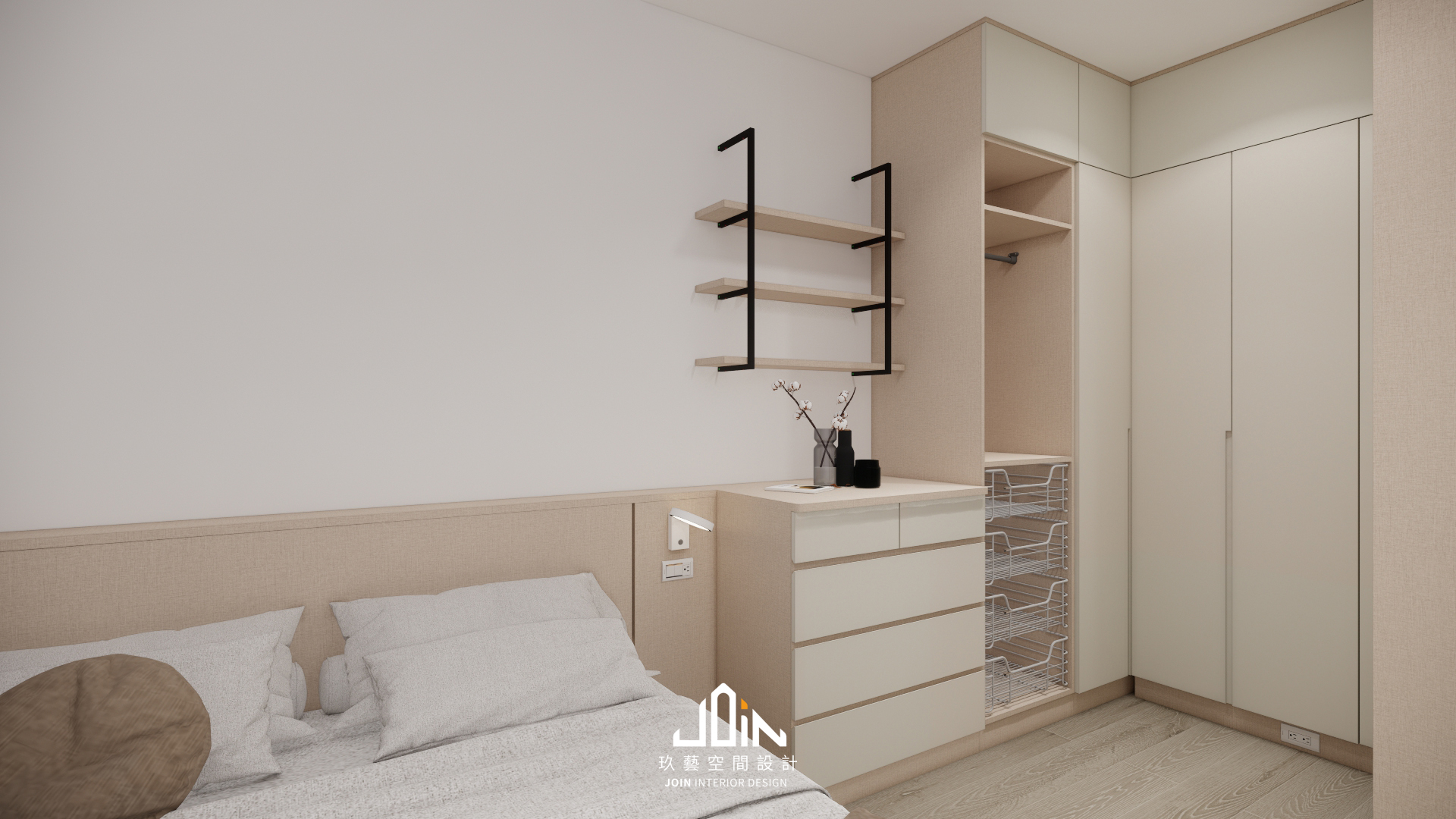 編織感櫃體、自然木紋層板與穿衣鏡共構出進門的儀式感,