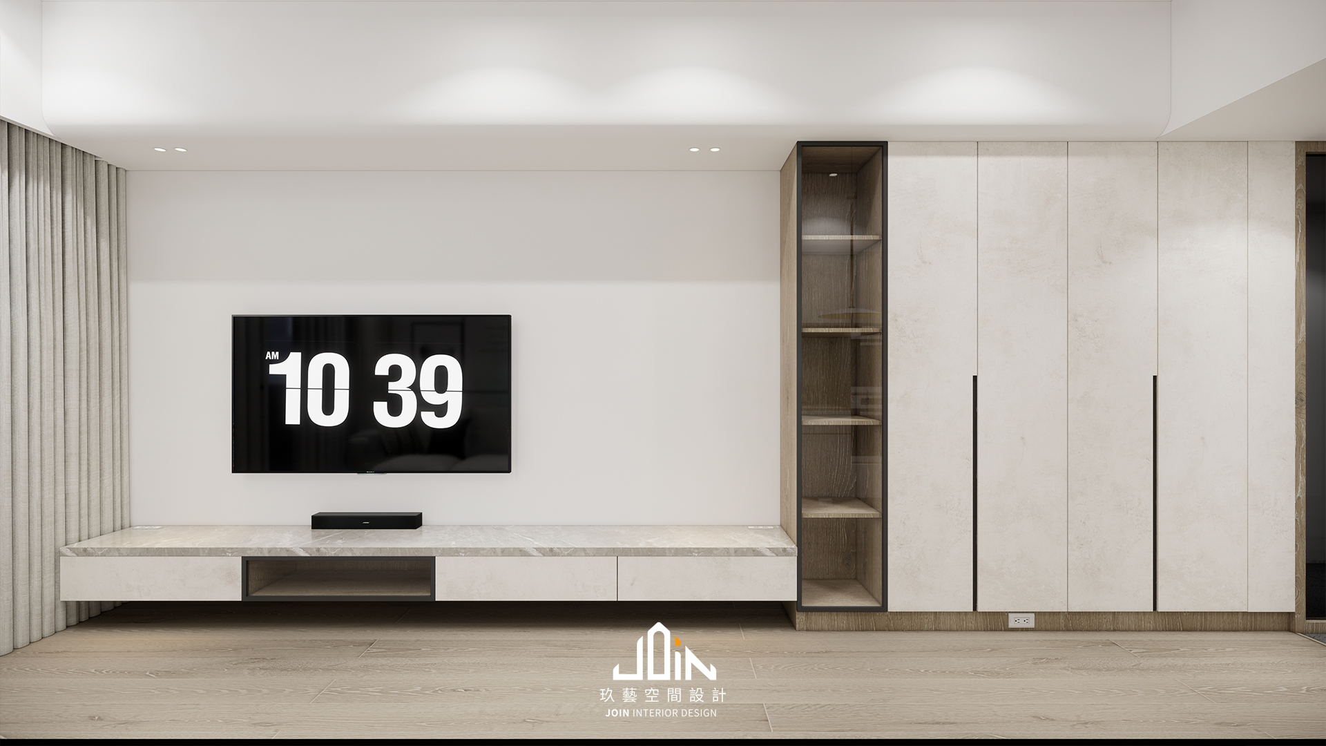 電視牆採用低彩度灰色塗料,搭配石紋檯面與隱藏式收納,